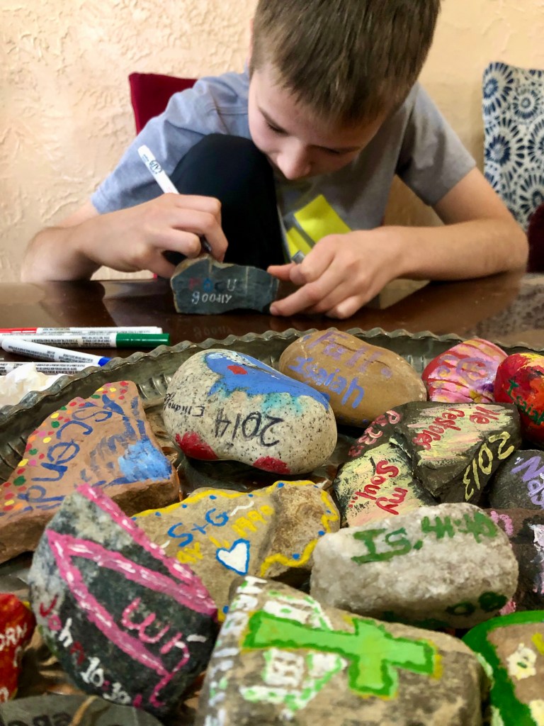 After a lifetime of this familiar rhythm of rock painting as a family—Zoe, Ella, and Jamin know how to join in.  They tell their own stories of remembrance and listen to ours.